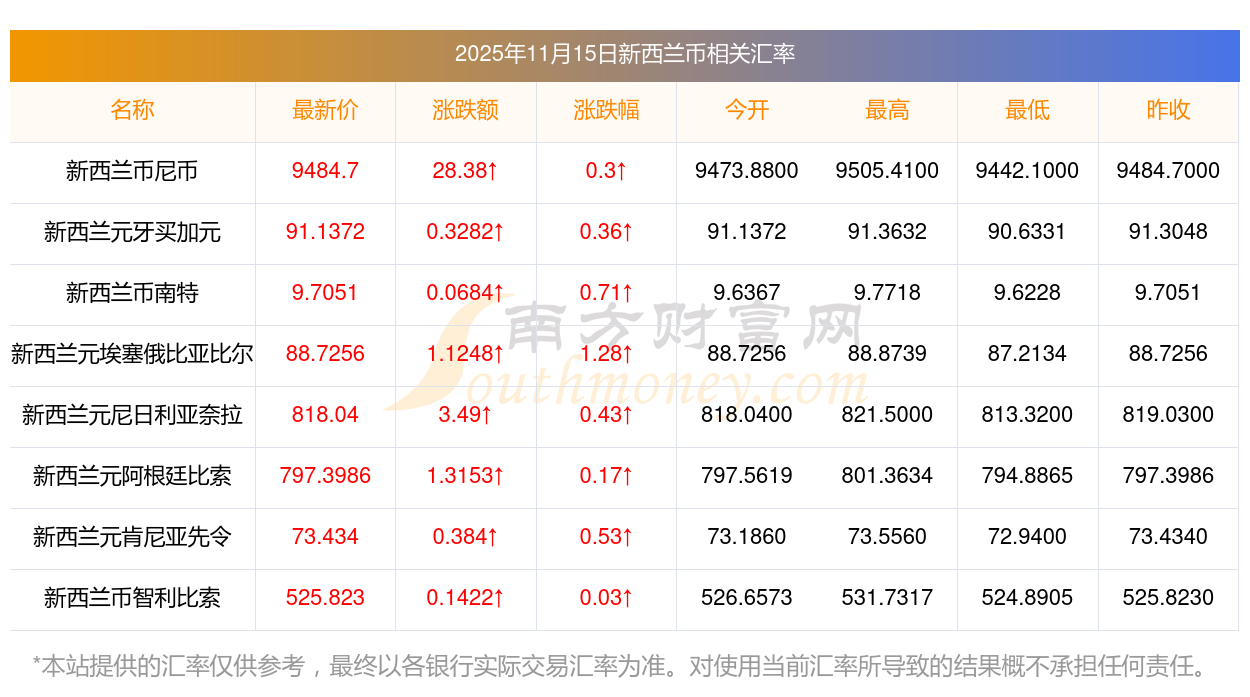 2025年11月15日新西蘭幣相關(guān)匯率查詢