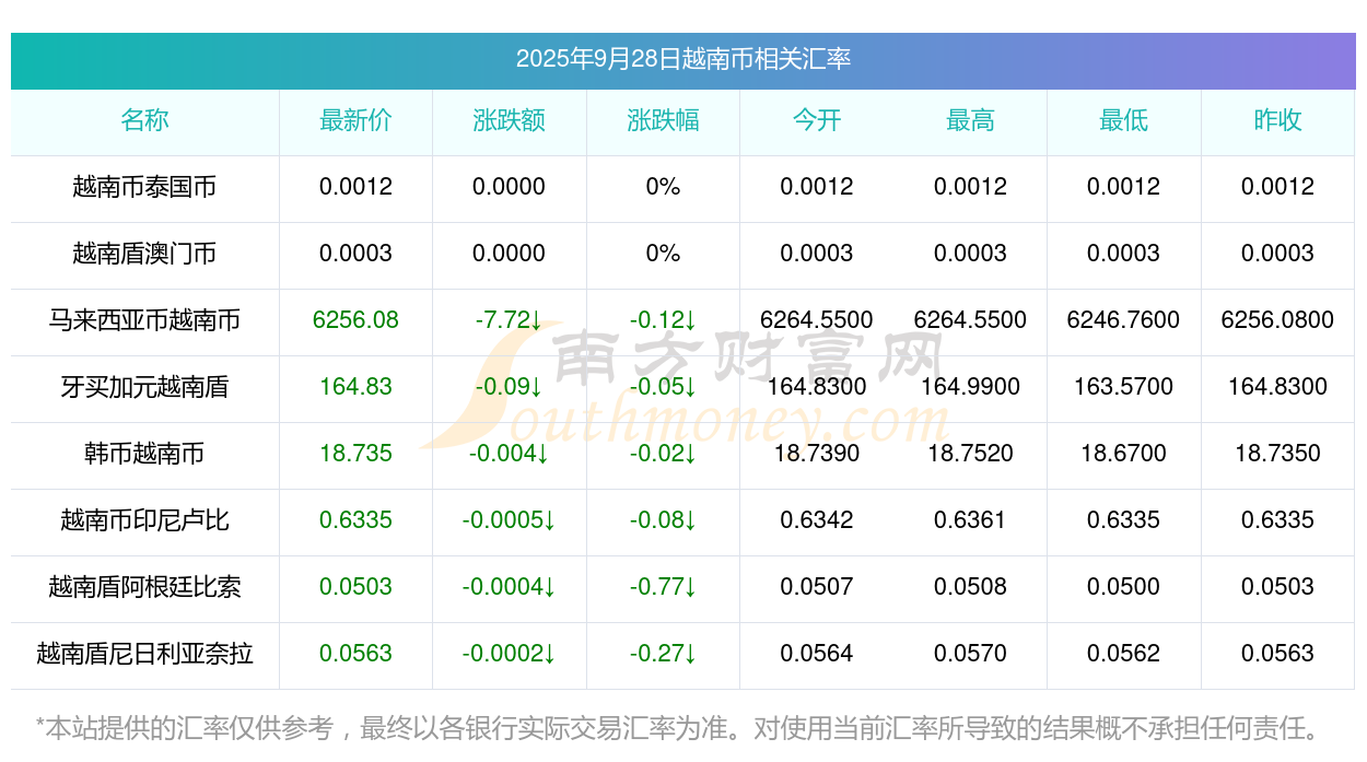 根據(jù)2025年9月28日匯率計算,VND兌換CZK匯率最新價0.000786:今開價0.0008,昨收價0.0008,最高價0.0008,最低價0.0008。