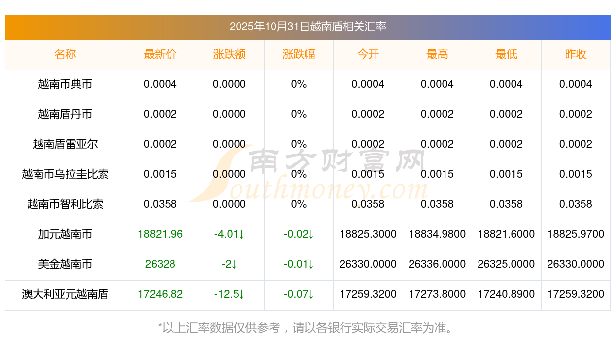 根據(jù)2025年10月31日匯率,越南盾兌換摩洛哥迪拉姆匯率最新0.000352,今開(kāi)0.0004,昨收0.0004,最高0.0004,最低0.0004。