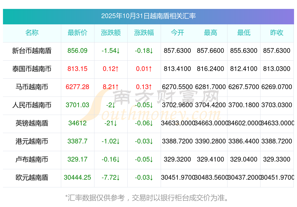 根據(jù)今天2025年10月31日匯率計算,VND兌換DKK匯率最新價0.000245,今開價0.0002,昨收價0.0002,最高價0.0002,最低價0.0002。