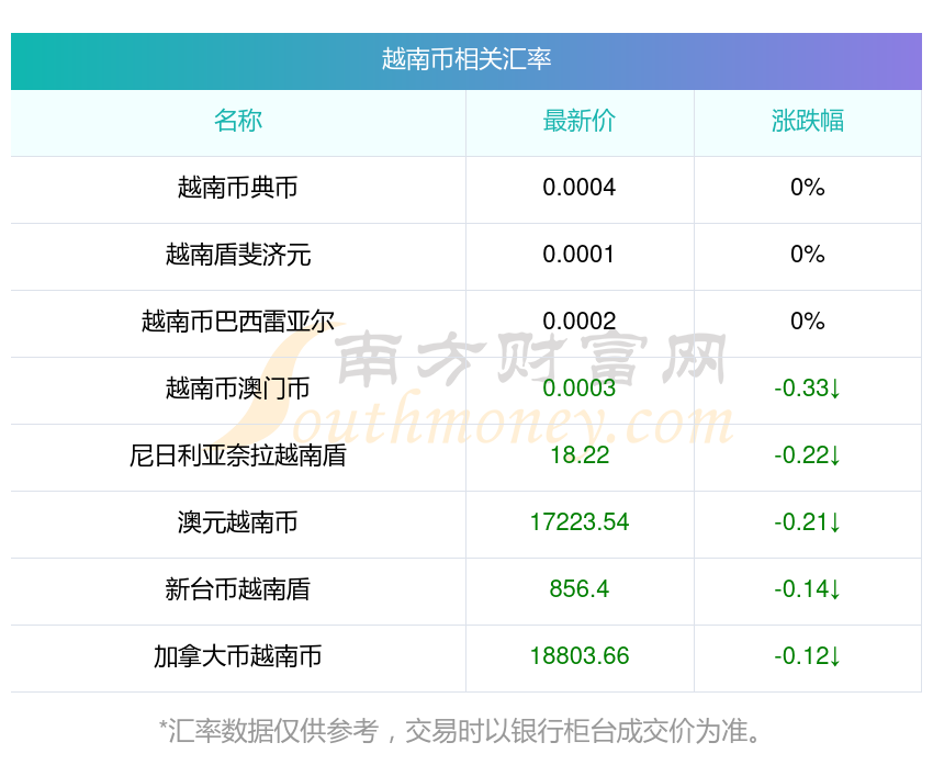 南方財富網(wǎng)為您提供越南幣對澳門幣匯率最新價格詳情。