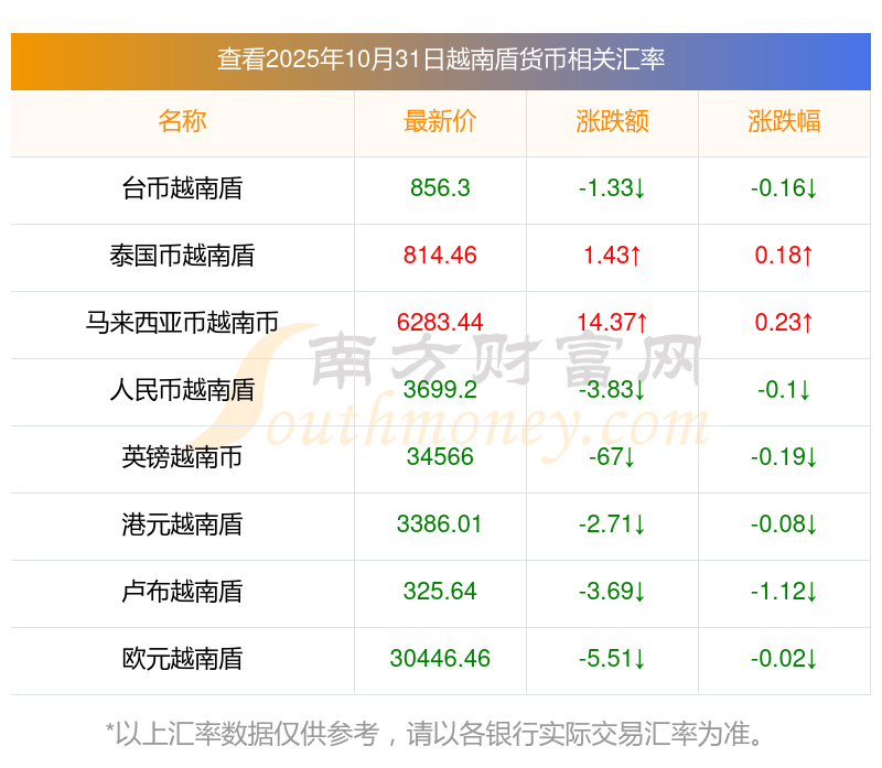根據(jù)2025年10月31日匯率計算,VND兌換CDF匯率最新價0.087100:今開價0.0871,昨收價0.0871,最高價0.0871,最低價0.0855。