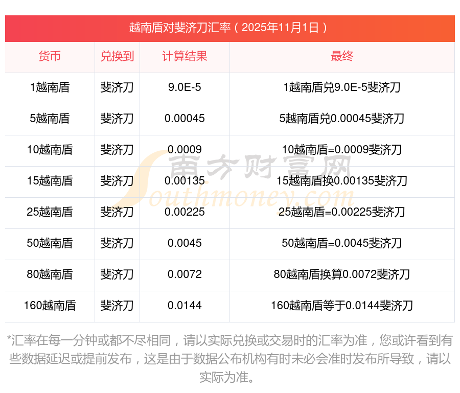 今日2025年11月1日越南盾兌換斐濟(jì)刀最新匯率多少?