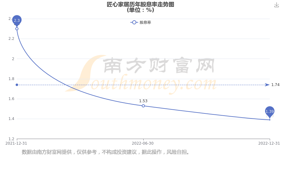 匠心家居最新一次公布的分紅方案為10派5元。本次權(quán)益分派股權(quán)登記日為2023年5月19日,除權(quán)除息日為2023年5月22日,派息日為2023年5月22日。