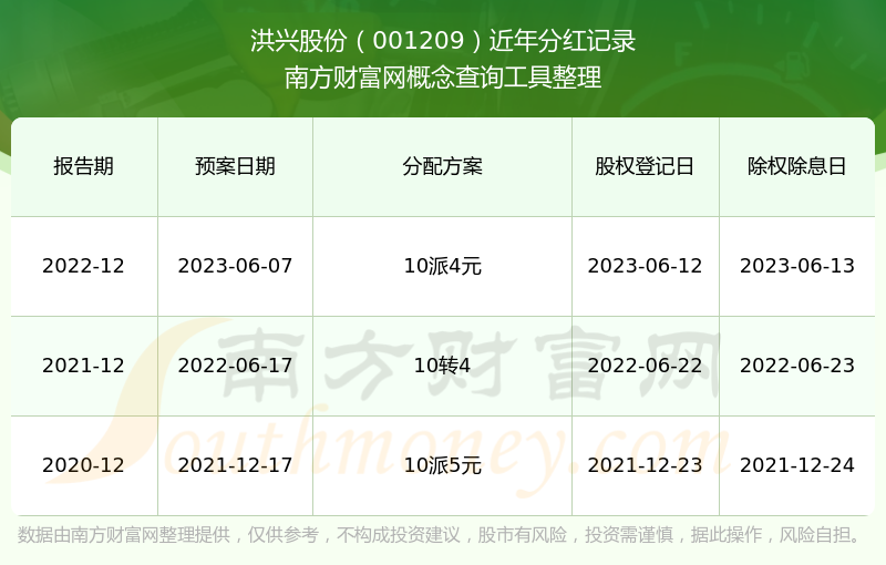 洪興股份最新一次公布的分紅方案為10派4元。本次權(quán)益分派股權(quán)登記日為2023年6月12日,除權(quán)除息日為2023年6月13日,派息日為2023年6月13日。