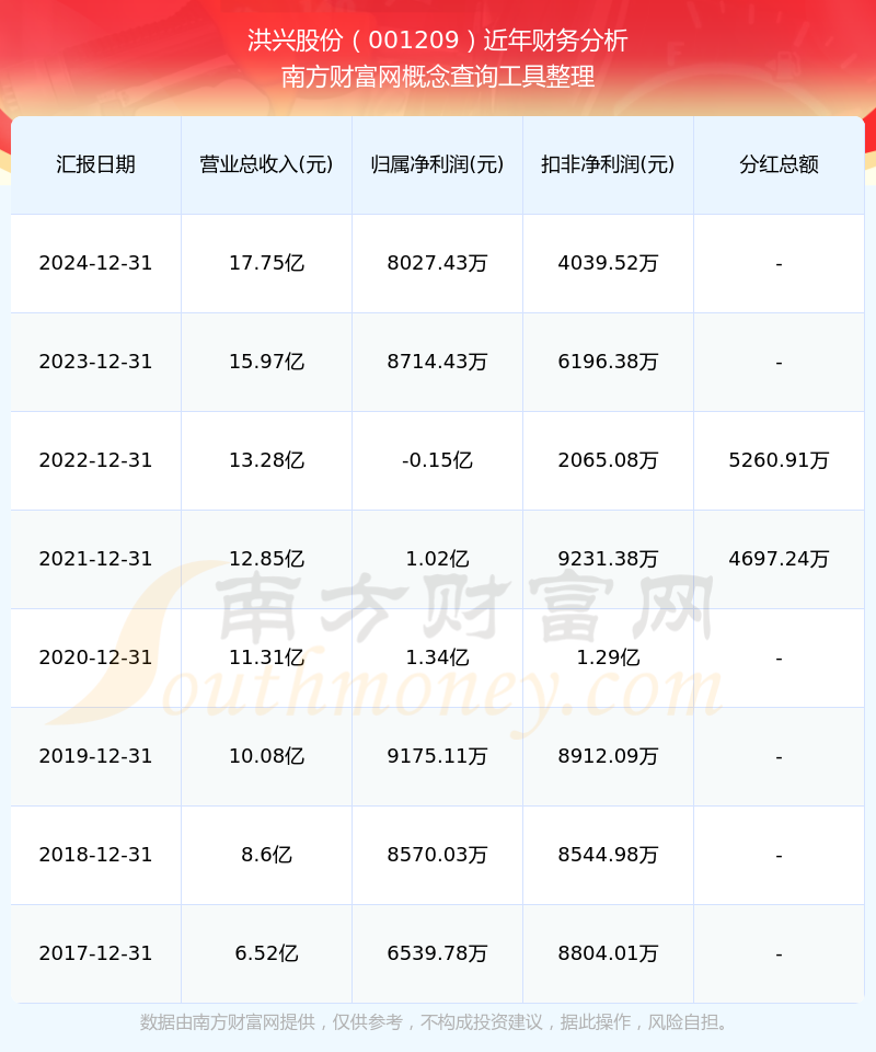 2024年報(bào)顯示,洪興股份實(shí)現(xiàn)營(yíng)收17.75億,同比增長(zhǎng)11.18%;凈利潤(rùn)8027.43萬,同比增長(zhǎng)-7.88%;毛利率33.16%。