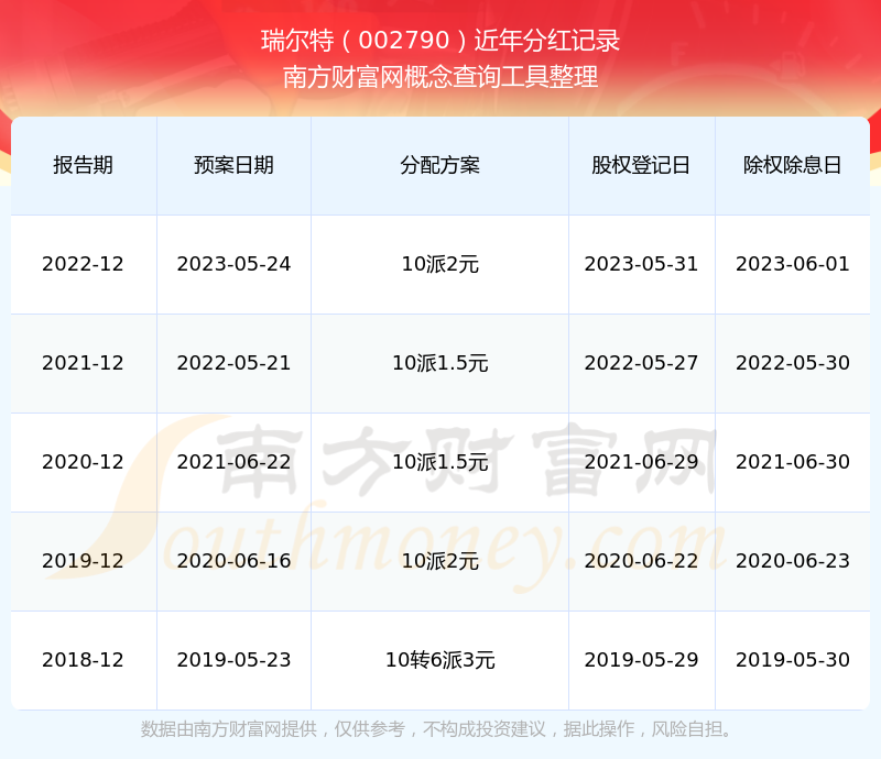 瑞爾特最新一次公布的分紅方案:10派2元。