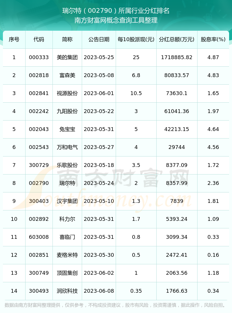 按照南方財(cái)富網(wǎng)趨勢(shì)選股系統(tǒng)統(tǒng)計(jì),瑞爾特所屬行業(yè)為坐便器行業(yè),坐便器行業(yè)分紅排名情況如下表:
