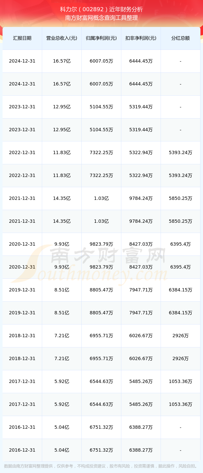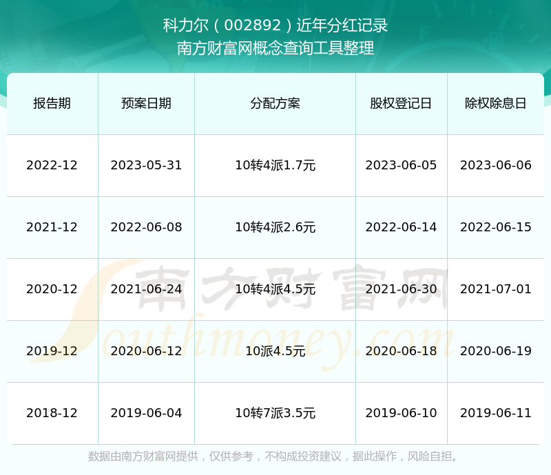 科力爾歷年分紅派息情況如下表所示: