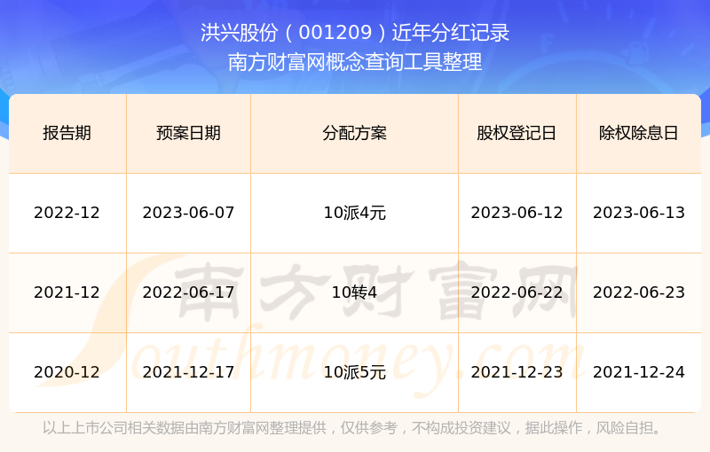 洪興股份最新一次公布的分紅方案為10派4元。本次權(quán)益分派股權(quán)登記日為2023年6月12日,除權(quán)除息日為2023年6月13日,派息日為2023年6月13日。