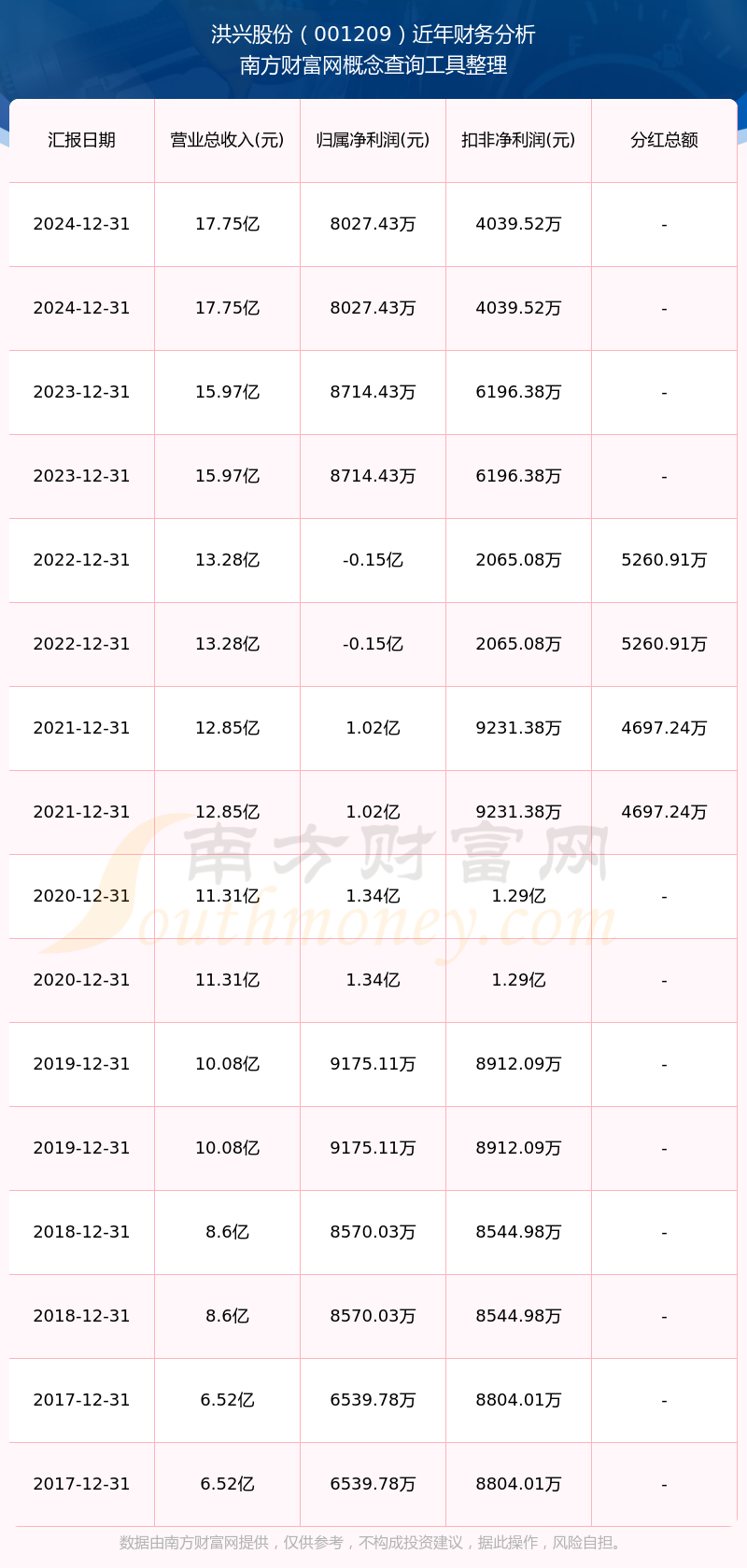 洪興股份2024年總營收17.75億,同比增長11.18%;凈利潤8027.43萬,同比增長-7.88%;銷售毛利率33.16%。
