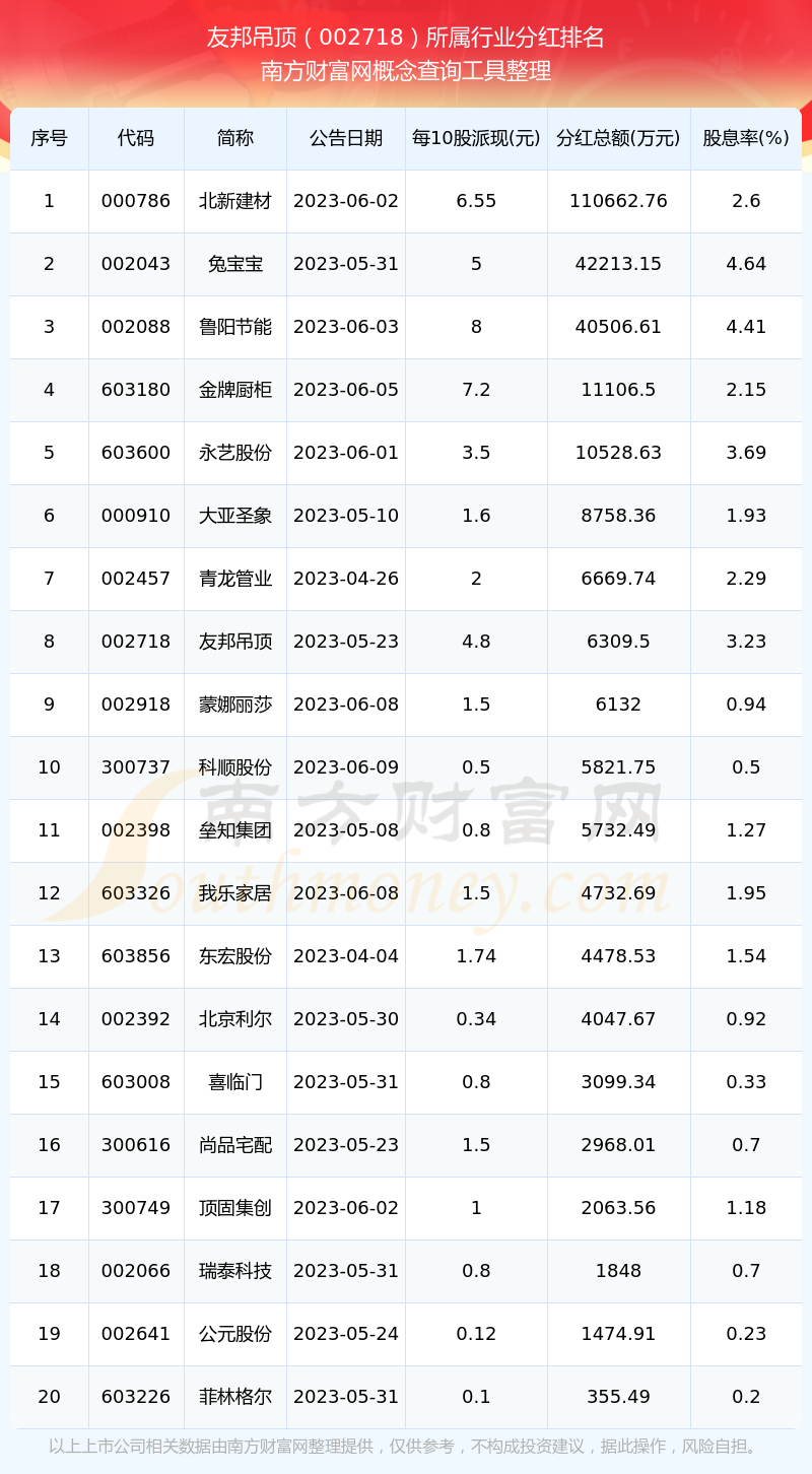按照南方財富網(wǎng)趨勢選股系統(tǒng)統(tǒng)計,友邦吊頂所屬行業(yè)為建筑材料行業(yè),建筑材料行業(yè)分紅排名情況如下表: