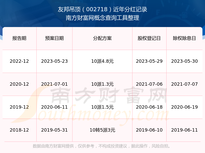 友邦吊頂最新一次公布的分紅方案:10派4.8元。
