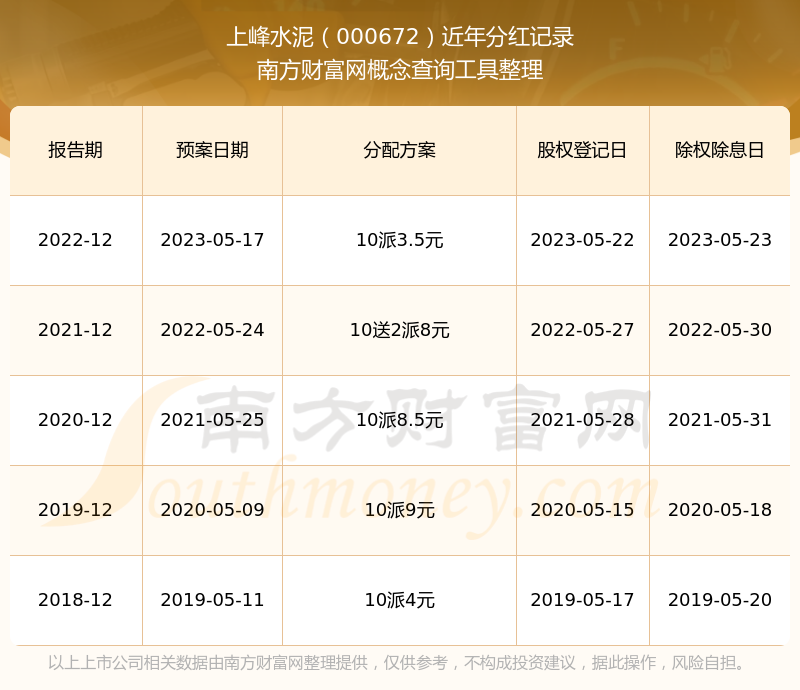 上峰水泥最新一次公布的分紅方案為10派3.5元。本次權(quán)益分派股權(quán)登記日為2023年5月22日,除權(quán)除息日為2023年5月23日,派息日為2023年5月23日。