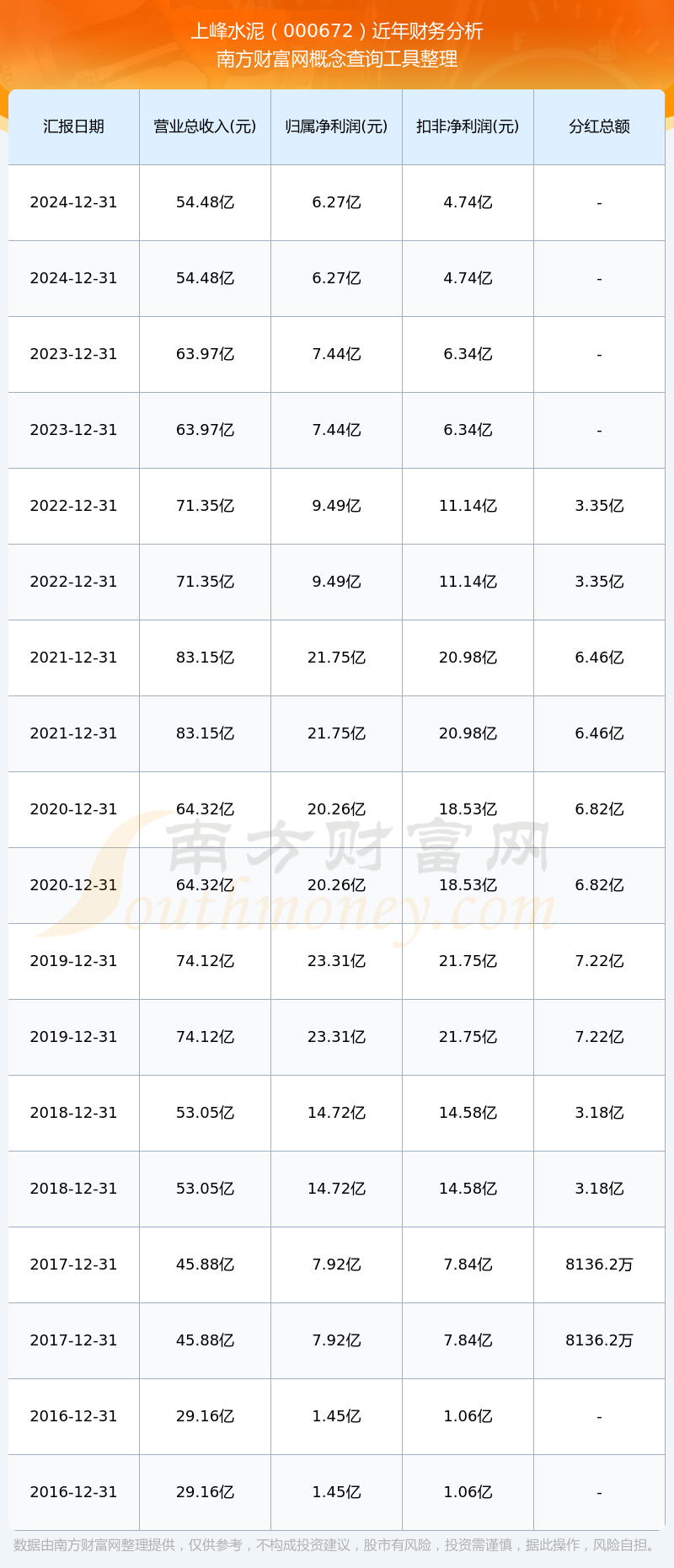 上峰水泥公司2024年實(shí)現(xiàn)營收54.48億元,凈利潤6.27億元,毛利率26.16%。