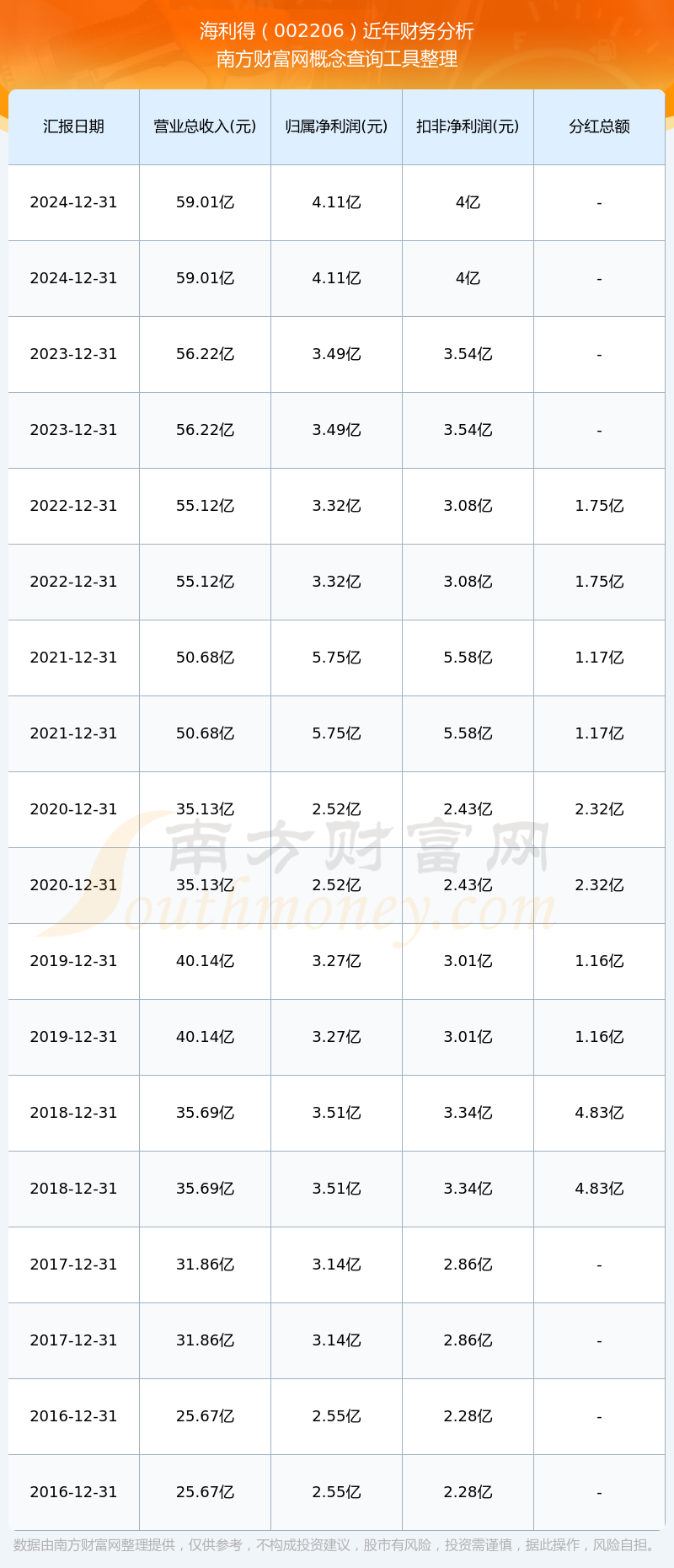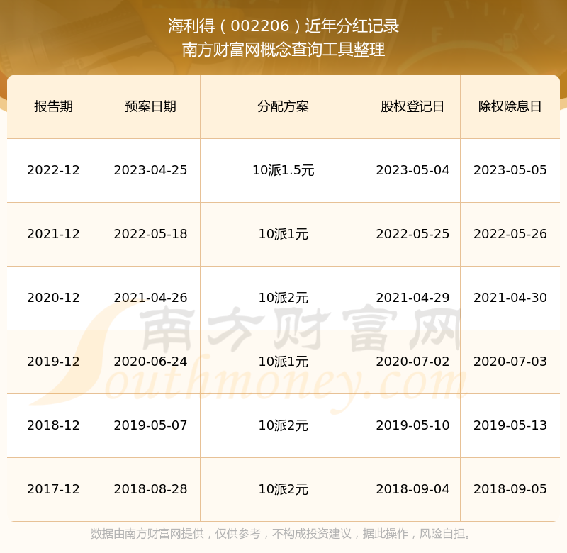 海利得歷年分紅派息情況如下表所示: