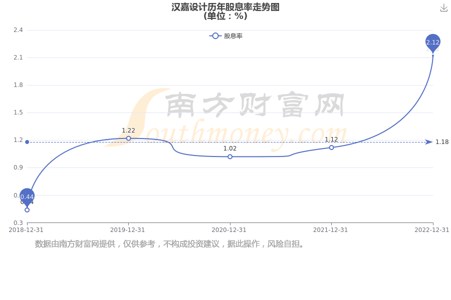 近年漢嘉設(shè)計(jì)年度股息率走勢如下圖: