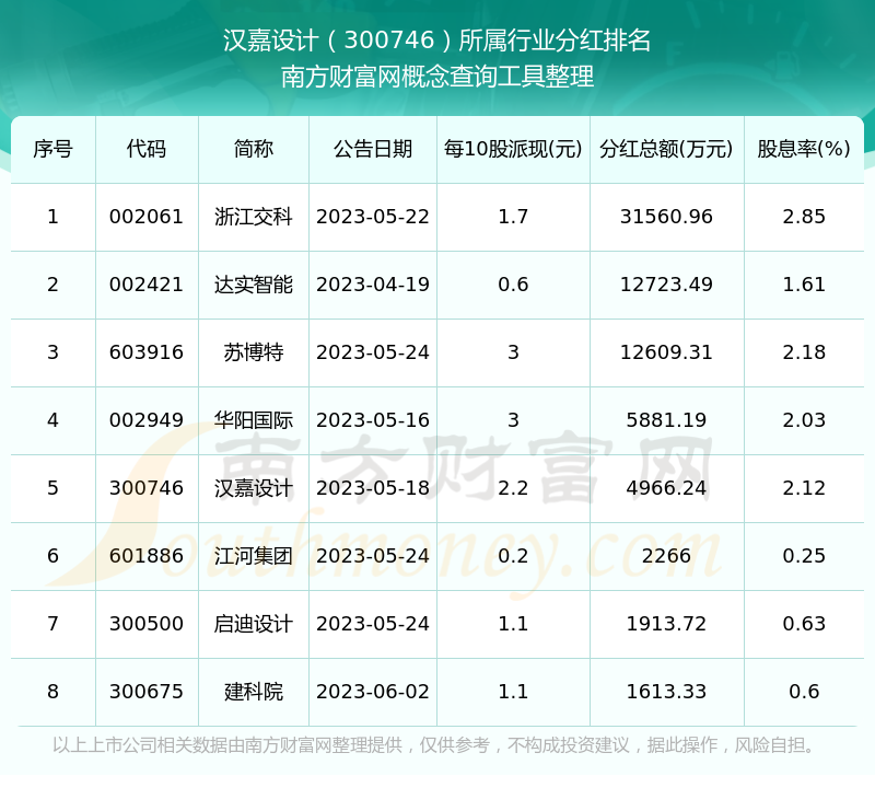 二、漢嘉設(shè)計(jì)300746行業(yè)分紅排名