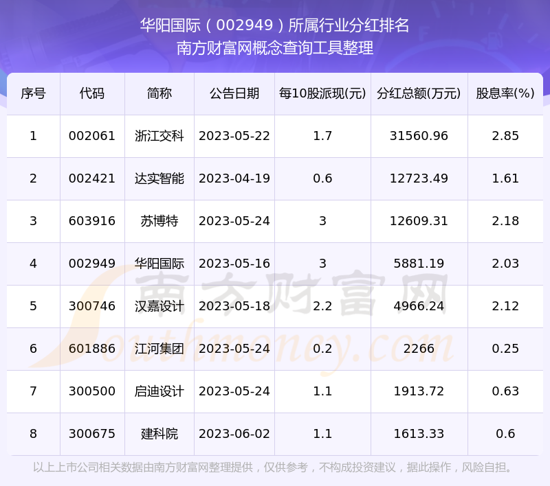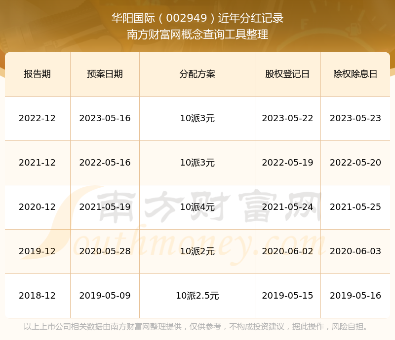 華陽國際最新一次公布的分紅方案為10派3元。本次權益分派股權登記日為2023年5月22日,除權除息日為2023年5月23日,派息日為2023年5月23日。