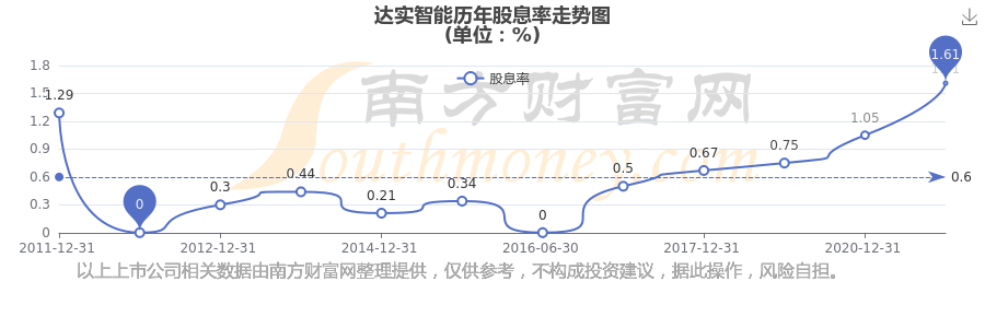 近年達(dá)實(shí)智能年度股息率走勢(shì)如下圖: