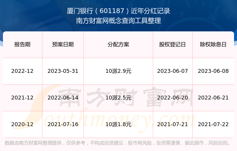廈門銀行最新一次公布的分紅方案為10派2.9元。本次權(quán)益分派股權(quán)登記日為2023年6月7日,除權(quán)除息日為2023年6月8日,派息日為2023年6月8日。