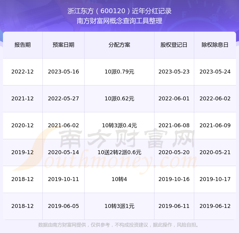 浙江東方最新一次公布的分紅方案為10派0.79元。本次權(quán)益分派股權(quán)登記日為2023年5月23日,除權(quán)除息日為2023年5月24日,派息日為2023年5月24日。