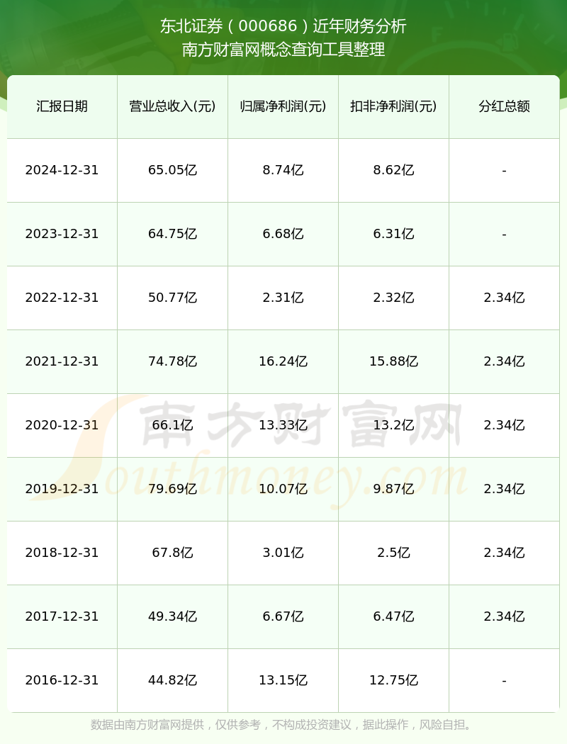 2024年東北證券總營收65.05億,同比增長0.46%;凈利潤8.74億。