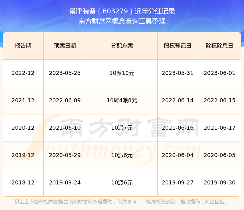 景津裝備最新一次公布的分紅方案:10派10元。