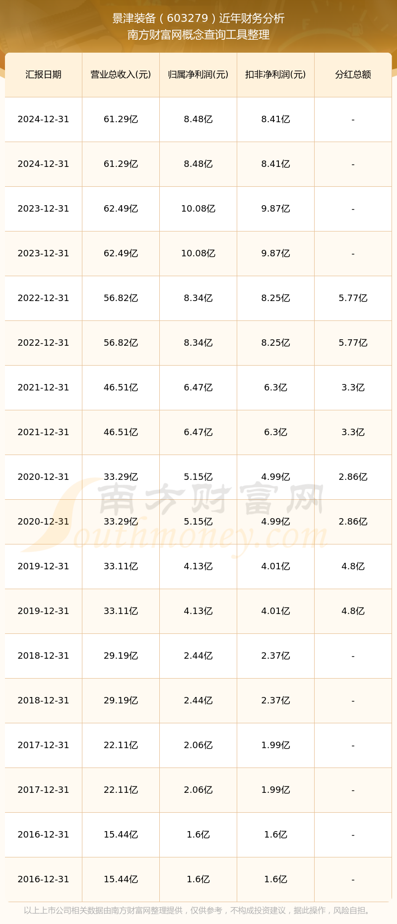 景津裝備歷年分紅派息情況如下表所示: