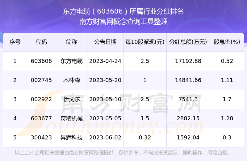 按照南方財富網(wǎng)趨勢選股系統(tǒng)統(tǒng)計,東方電纜所屬行業(yè)為電氣機(jī)械行業(yè),電氣機(jī)械行業(yè)分紅排名情況如下表: