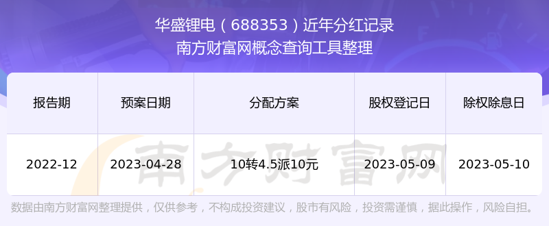 華盛鋰電最新一次公布的分紅方案為10轉(zhuǎn)4.5派10元。本次權(quán)益分派股權(quán)登記日為2023年5月9日,除權(quán)除息日為2023年5月10日,派息日為2023年5月10日。