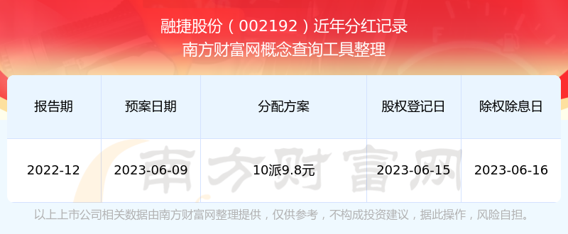 融捷股份最新一次公布的分紅方案為10派9.8元。本次權(quán)益分派股權(quán)登記日為2023年6月15日,除權(quán)除息日為2023年6月16日,派息日為2023年6月16日。