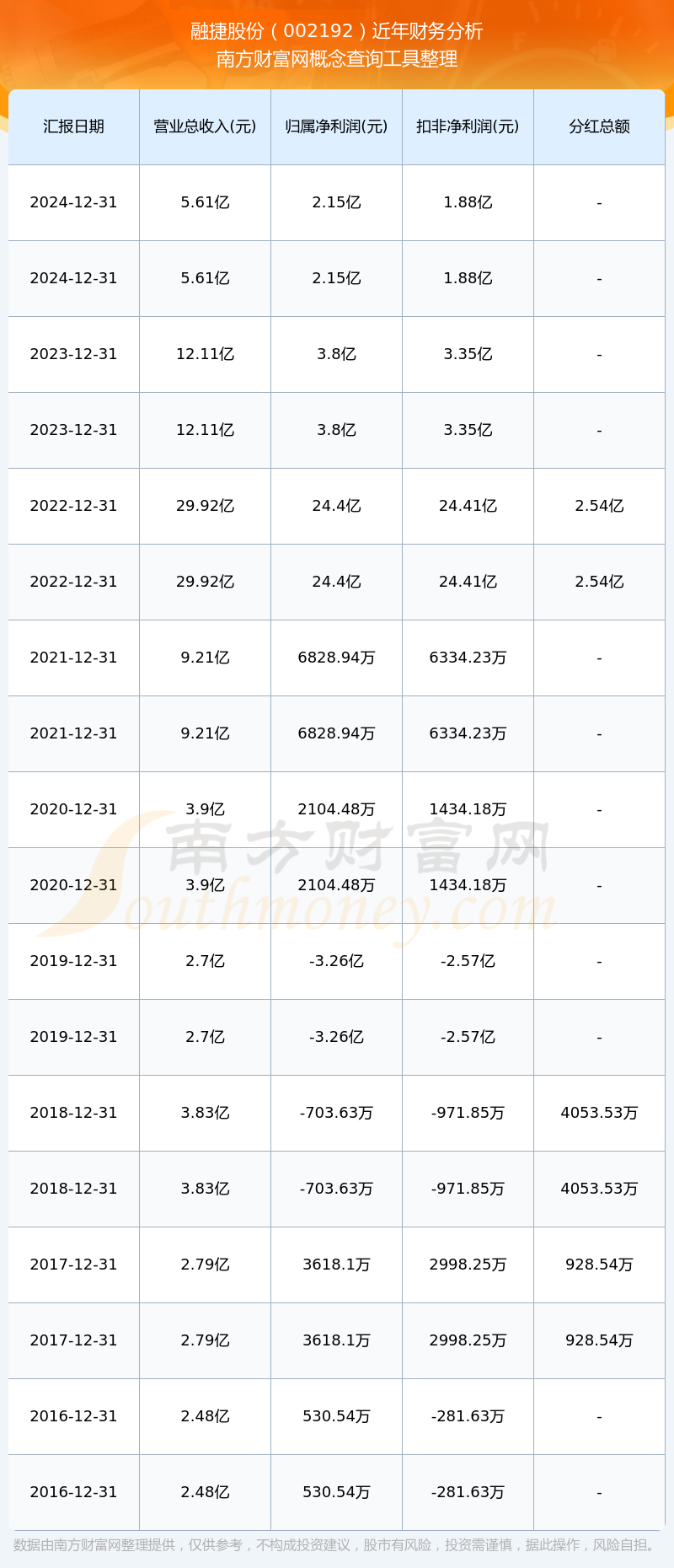 2024年融捷股份總營收5.61億,同比增長-53.64%;凈利潤2.15億,同比增長-43.41%;銷售毛利率47.53%。