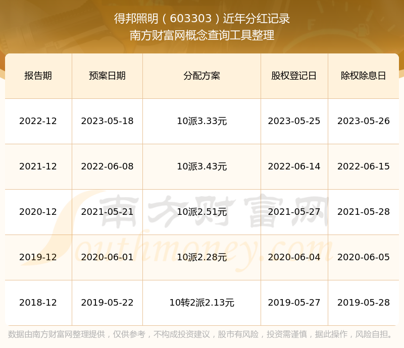 得邦照明最新一次公布的分紅方案為10派3.33元。本次權(quán)益分派股權(quán)登記日為2023年5月25日,除權(quán)除息日為2023年5月26日,派息日為2023年5月26日。