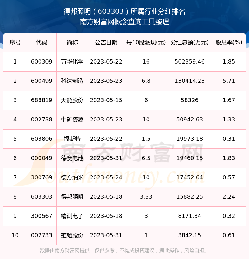 按照南方財富網(wǎng)趨勢選股系統(tǒng)統(tǒng)計,得邦照明所屬行業(yè)為家電行業(yè)行業(yè),家電行業(yè)行業(yè)分紅排名情況如下表:
