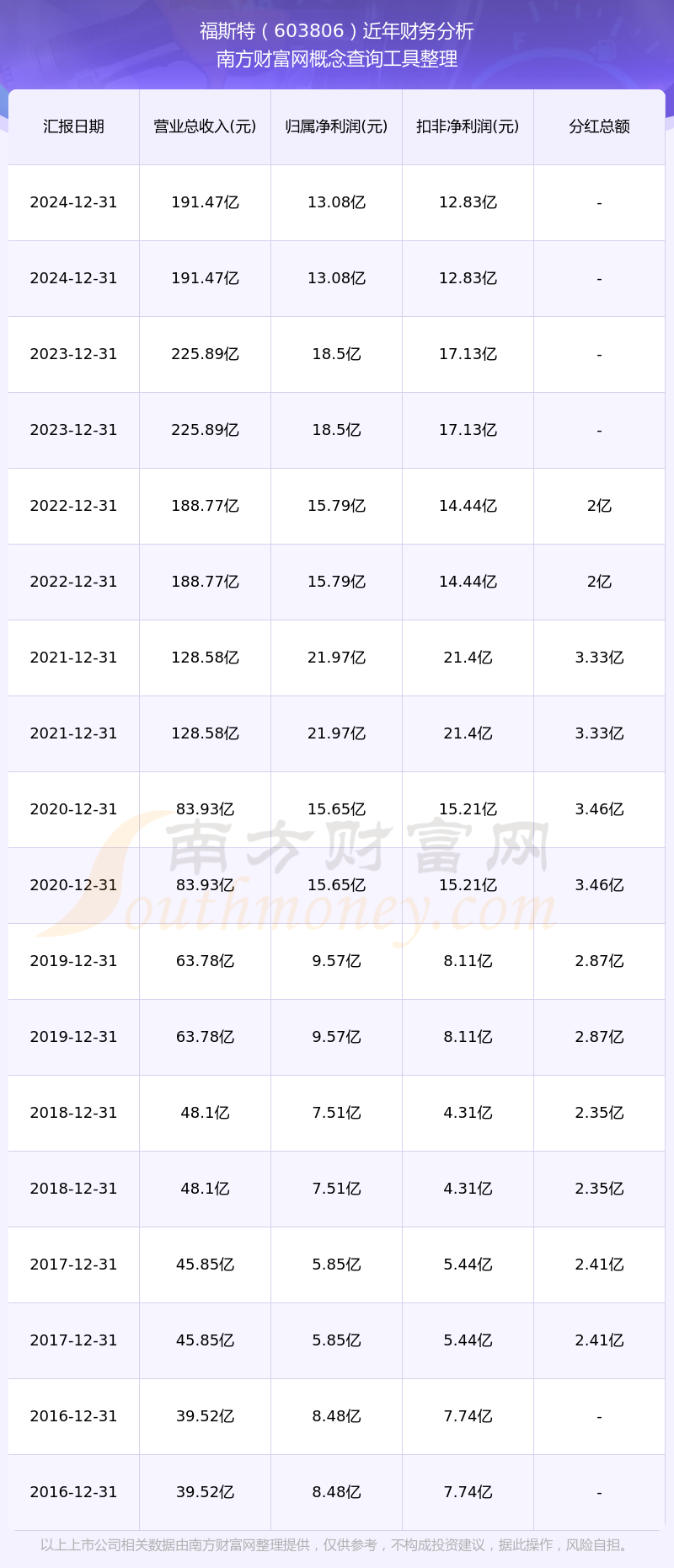 福斯特歷年分紅派息情況如下表所示: