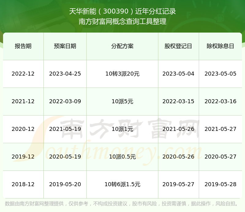 天華新能最新一次公布的分紅方案為10轉(zhuǎn)3派20元。本次權(quán)益分派股權(quán)登記日為2023年5月4日,除權(quán)除息日為2023年5月5日,派息日為2023年5月5日。
