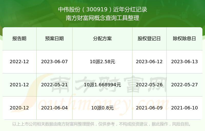 中偉股份最新一次公布的分紅方案為10派2.58元。本次權(quán)益分派股權(quán)登記日為2023年6月12日,除權(quán)除息日為2023年6月13日,派息日為2023年6月13日。