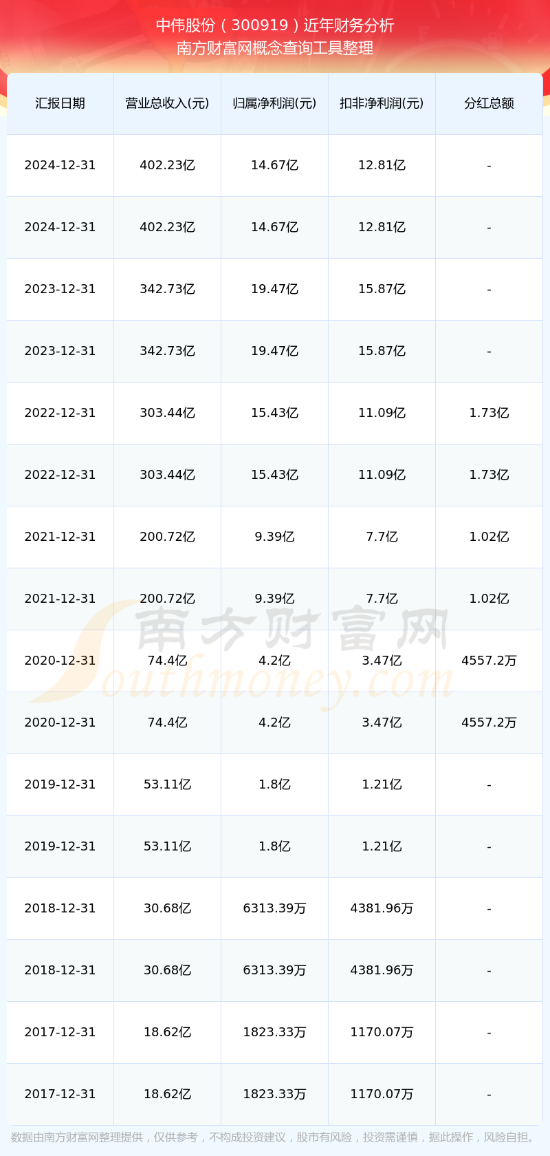2024年報(bào)顯示,中偉股份實(shí)現(xiàn)營收402.23億,同比增長17.36%;凈利潤14.67億,同比增長-24.64%;毛利率12.12%。