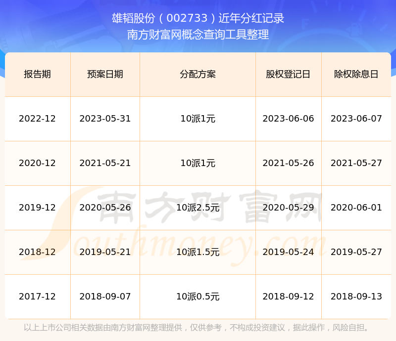 雄韜股份最新一次公布的分紅方案為10派1元。本次權(quán)益分派股權(quán)登記日為2023年6月6日,除權(quán)除息日為2023年6月7日,派息日為2023年6月7日。