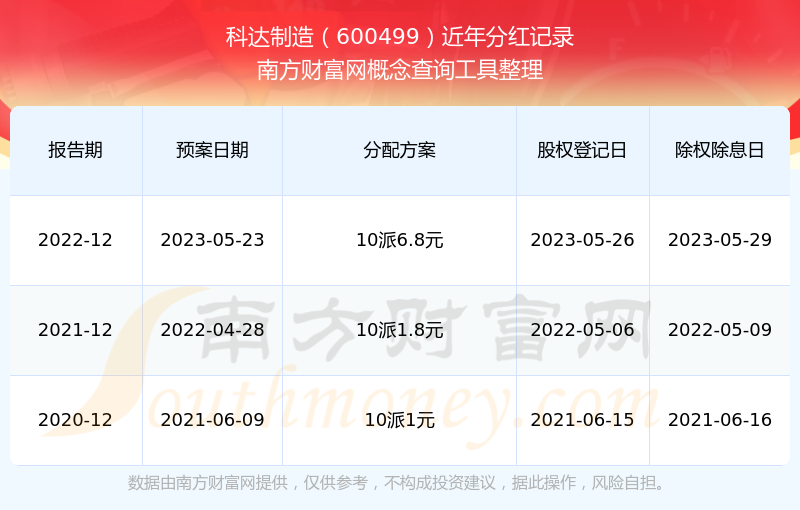 科達(dá)制造最新一次公布的分紅方案為10派6.8元。本次權(quán)益分派股權(quán)登記日為2023年5月26日,除權(quán)除息日為2023年5月29日,派息日為2023年5月29日。