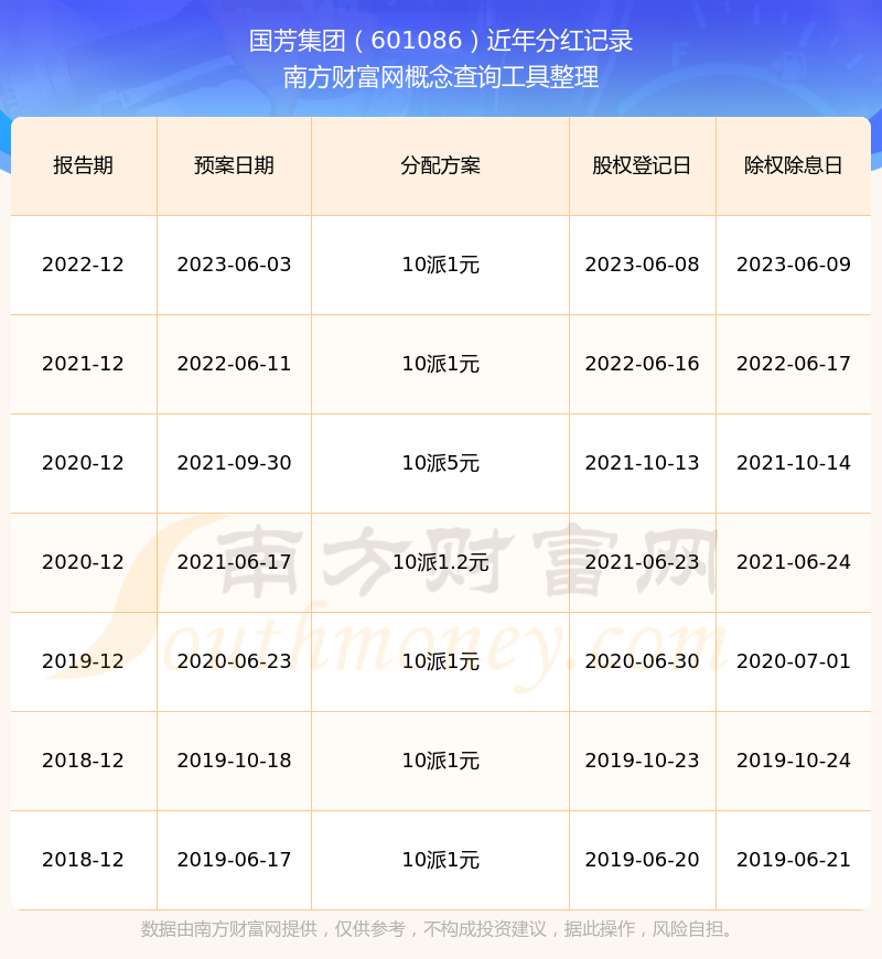 國(guó)芳集團(tuán)最新一次公布的分紅方案為10派1元。本次權(quán)益分派股權(quán)登記日為2023年6月8日,除權(quán)除息日為2023年6月9日,派息日為2023年6月9日。