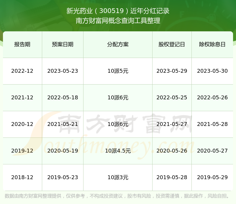新光藥業(yè)最新一次公布的分紅方案為10派5元。本次權(quán)益分派股權(quán)登記日為2023年5月29日,除權(quán)除息日為2023年5月30日,派息日為2023年5月30日。