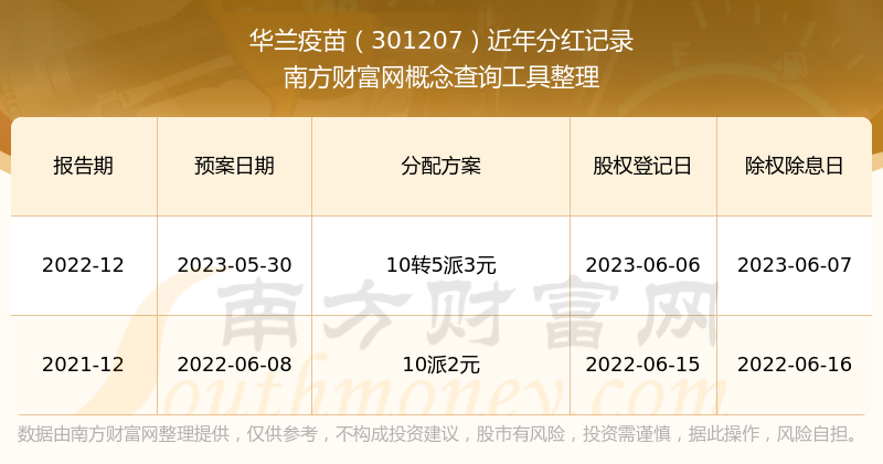 華蘭疫苗最新一次公布的分紅方案為10轉(zhuǎn)5派3元。本次權(quán)益分派股權(quán)登記日為2023年6月6日,除權(quán)除息日為2023年6月7日,派息日為2023年6月7日。
