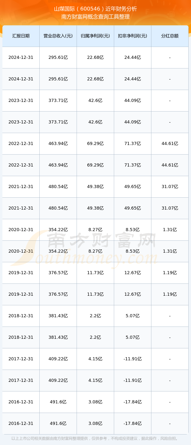 山煤國際歷年分紅派息情況如下表所示: