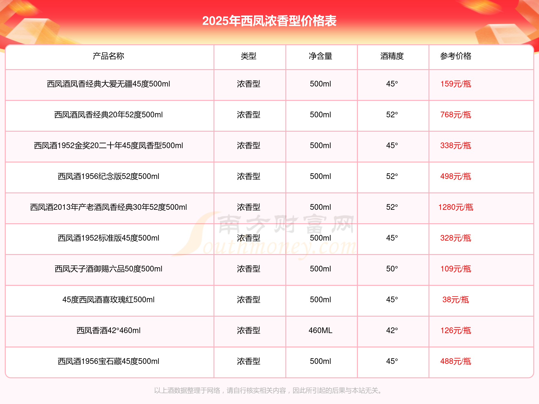 2025年,西鳳濃香型酒價格最高的是西鳳酒 酒海私藏55度3000ml,參考價8880元,最低的是西鳳酒傳世名釀V1852度500ml,參考價29元,價格高低差為8851元。