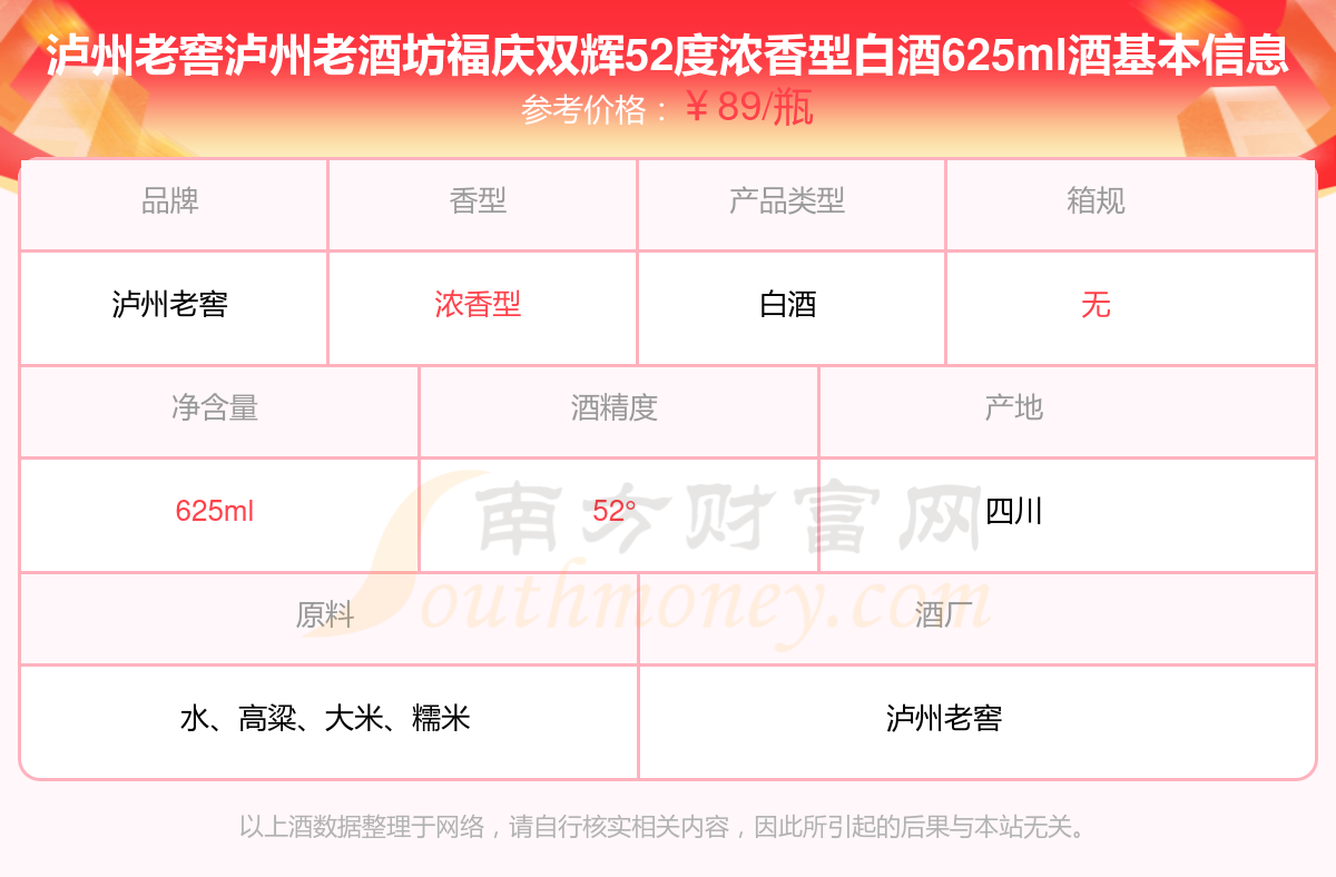 瀘州老窖瀘州老酒坊福慶雙輝52度濃香型白酒625ml基本信息