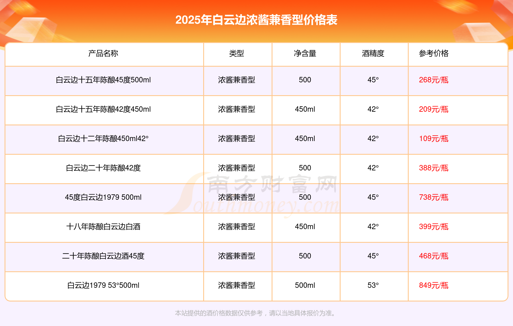 2025白云邊濃醬兼香型酒最新價格:白云邊1979 53°500ml參考價849元/瓶、45度白云邊1979 500ml參考價738元/瓶、二十年陳釀白云邊酒45度參考價468元/瓶。