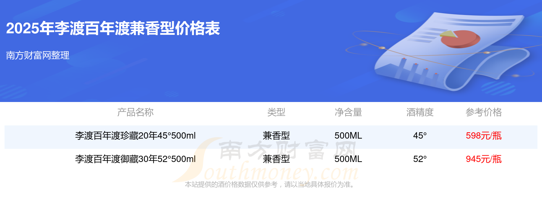 李渡百年渡兼香型酒最新價(jià)格2025:李渡百年渡御藏30年52°500ml參考價(jià)945元/瓶、李渡百年渡珍藏20年45°500ml參考價(jià)598元/瓶。