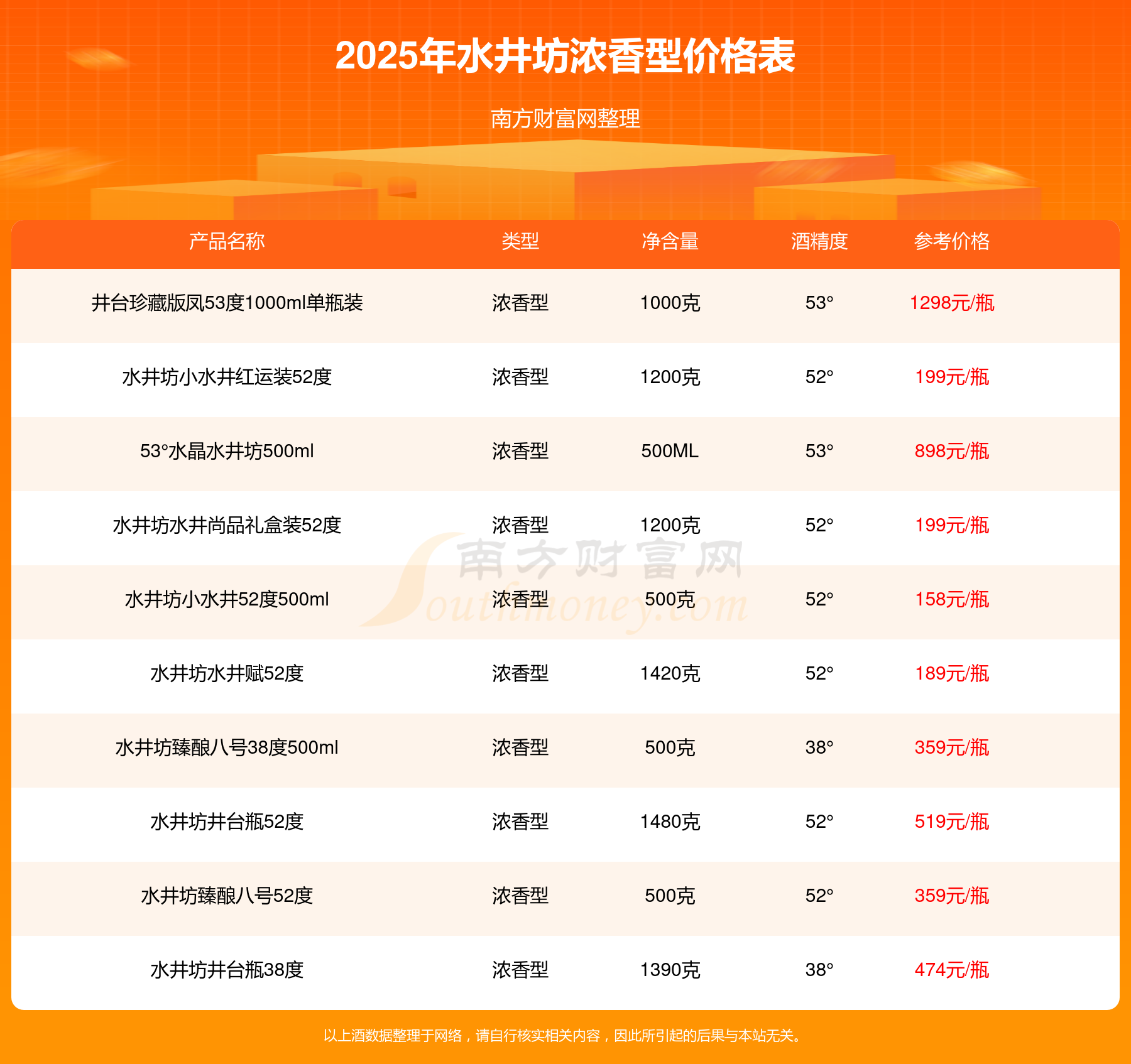 水井坊大壇收藏級原漿天球瓶66度參考價13999元/瓶、水井坊博物館壹號53度雙瓶裝參考價10988元/瓶、53°水井坊公元十三600ml參考價2580元/瓶。